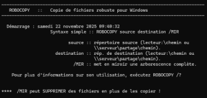 Robocopy, contraction de “Robust File Copy”, est l’un des outils les plus sous-estimés de l’écosystème Windows. Livré nativement avec Windows depuis Vista/Server 2008, il est devenu le couteau suisse des